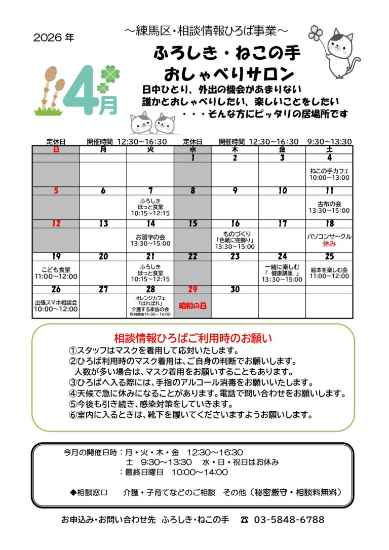 【ふろしき・ねこの手】イベントのご案内(2026年4月)